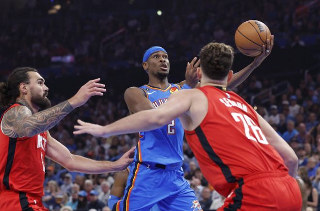 其他基本都是碾压!而雷霆拿到西部冠军的概率来到66%,拿到总冠军的概率是55%,这也创造纪录,NBA历史上有统计以来,雷霆是第一支赛季只打25场比赛的情况下,夺冠概率超过5成的球队。美媒提出一个疑问,谁能阻止这支雷霆(雷霆本赛季还没有让最强五人组同时出战:亚历山大+多特+杰威+霍姆格伦+哈滕)?球队实力冠绝联盟,无非两点,进攻很强,防守更强,从防守说起。本赛季防守效率第二的是勇士的111.9,雷霆和勇士的差距,等于勇士和防守效率联盟第25位快船(119.1)之间的差距。